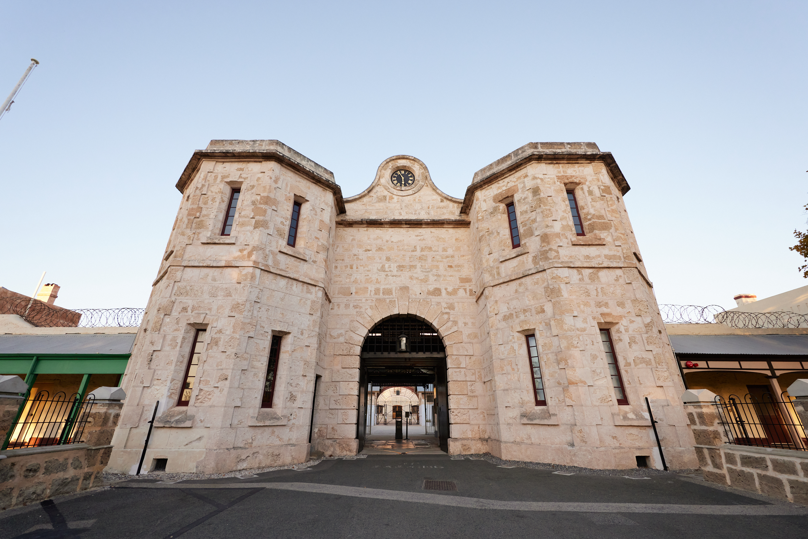 The Gatehouse and Entry Complex is a key historical, convict-built component of Fremantle Prison. The Gatehouse is part of the dominant facade of the Prison, with its central location on the Terrace emphasising its primacy and importance. It is highly visible on the approach to the Prison, highly intact relative to its original form and detailing, and retains its original intimidating castle-like character. Other convict-built elements of the Complex include the two Guard Rooms (now Non-Contact Visits Room and Gift Shop), Main Gates, Wray Gates and Fire Engine Room (now Generator Room), which together created a central enclosed courtyard. Later elements include the Reception Rooms, Visitor Room (now Switch Room), and Public Works Department (PWD) store (now Café).